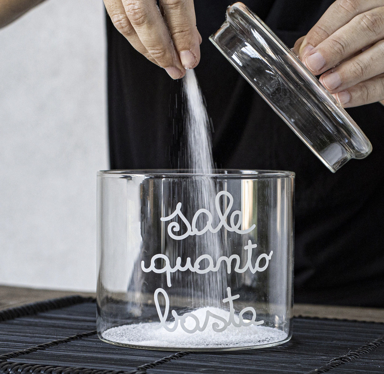 Barattolo per il sale in vetro borosilicato, un materiale che ha caratteristiche uniche, infatti nonostante sia leggerissimo è molto resistente, super trasparente e facile da pulire.