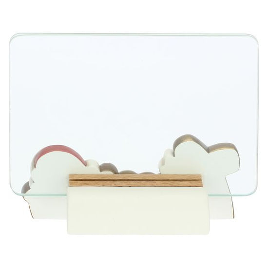 Misure: parte ceramica: 15x7x6,4 cm h; portafoto in vetro: 17×12,5 cm; spazio per foto: 10×15 cm h